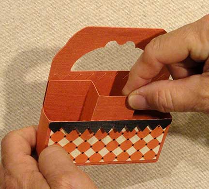 8. Apply glue to the bottom and back of one compartment, then position it on one side of the handle assembly to attach back of compartment to center support, bottom of compartment to bottom flap.
