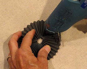 6. Try to hold the rosette in condensed shape with one hand (or get help) while a quick-grab glue like the hot glue shown here is applied at the top surface edge of the opening.